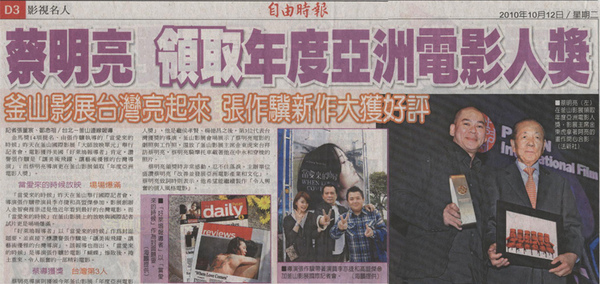 蔡明亮導演則獲頒今年釜山影展「年度亞洲電影人獎」,他是繼侯孝賢、楊德昌之後,第3位代表台灣獲獎的導演。釜山影展會場展示了蔡明亮電影的劇照與工作照,還放了釜山影展主席金東虎來台拜訪蔡明亮,蔡明亮騎摩托車載著他在中永和穿梭的照片。