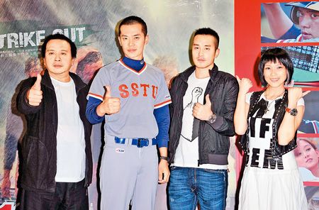 ▲姚元浩(左二)以新片《三振》重返大銀幕,恩師張作驥(左起)與好友張孝全、張本渝都站台力挺。(康鴻志攝)
